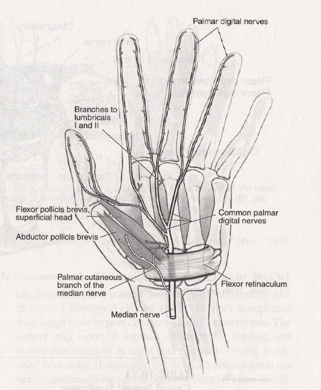 The median nerve and several tendons run from your forearm to your hand through a small space in your wrist called the carpal tunnel. The median nerve controls movement and feeling in your thumb and first three fingers (not your little finger).